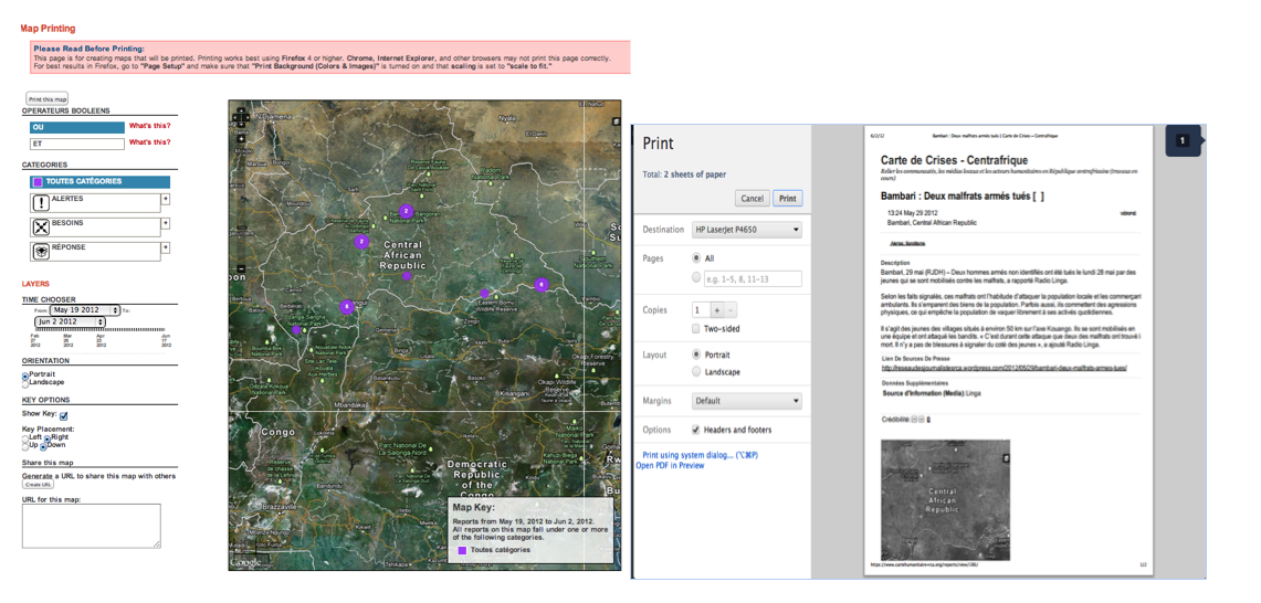 1. Printing Maps: the CAR map has a printing map functionality available for three different types of pages. The big map (which is our home page); the list of report page; and the single report page. The idea behind this customization is that you can print (or save as PDF) any report you like without having to copy and paste it manually. This also allows people to search for specific reports (like water needs in Bangui) and print the reports/save it.