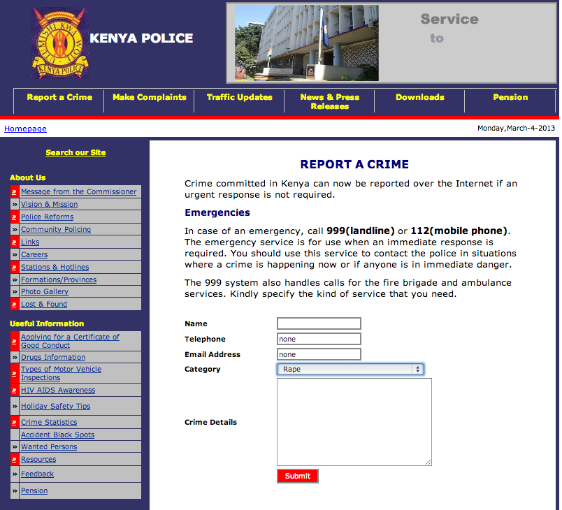 6. And finally the actual formal national emergency services aka, Kenya Police: 0800 720002 and the ambulance service: 0700395395 or 0738395395, which also has a web-form reporting system.